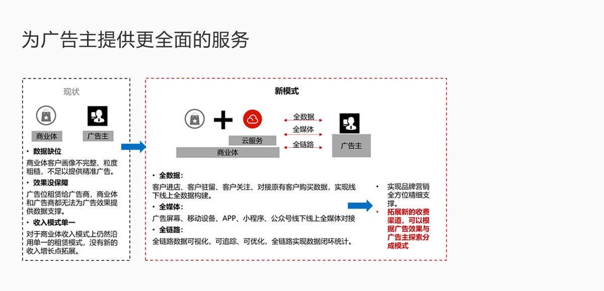 面对商场/门店出现的新情况、新挑战,惟道创新为商户提供更全面的服务,根据客户进店、客户驻留、客户关注、对接原有客户购买数据,实现线下线上全数据构建。推出广告屏幕、移动设备、APP、小程序、公众号线下线上全媒体对接。实现全链路数据可视化,可追踪、可优化,全链路实现数据闭环统计。