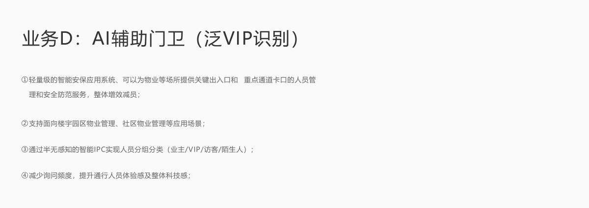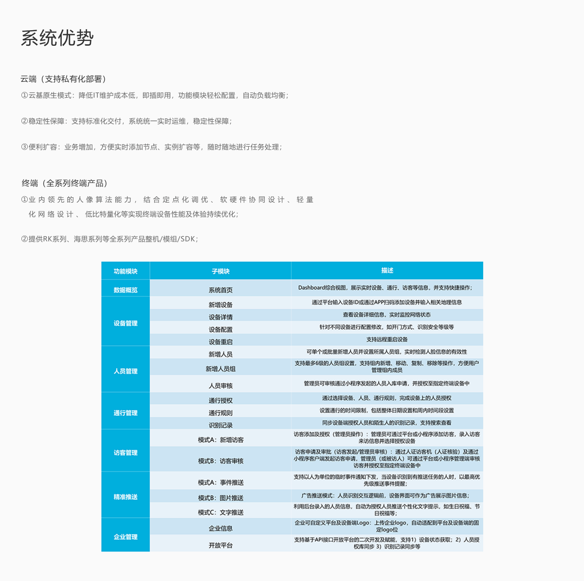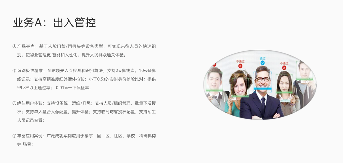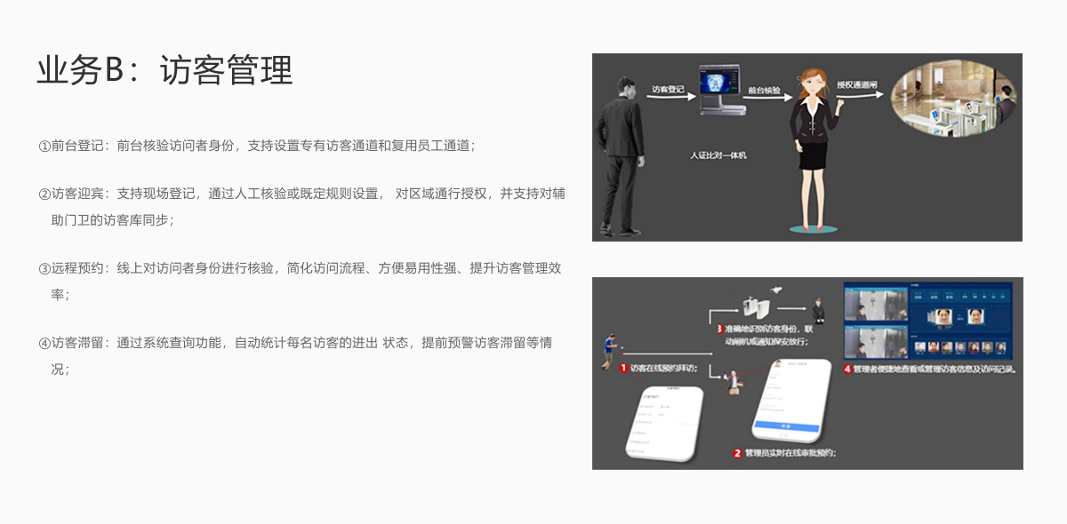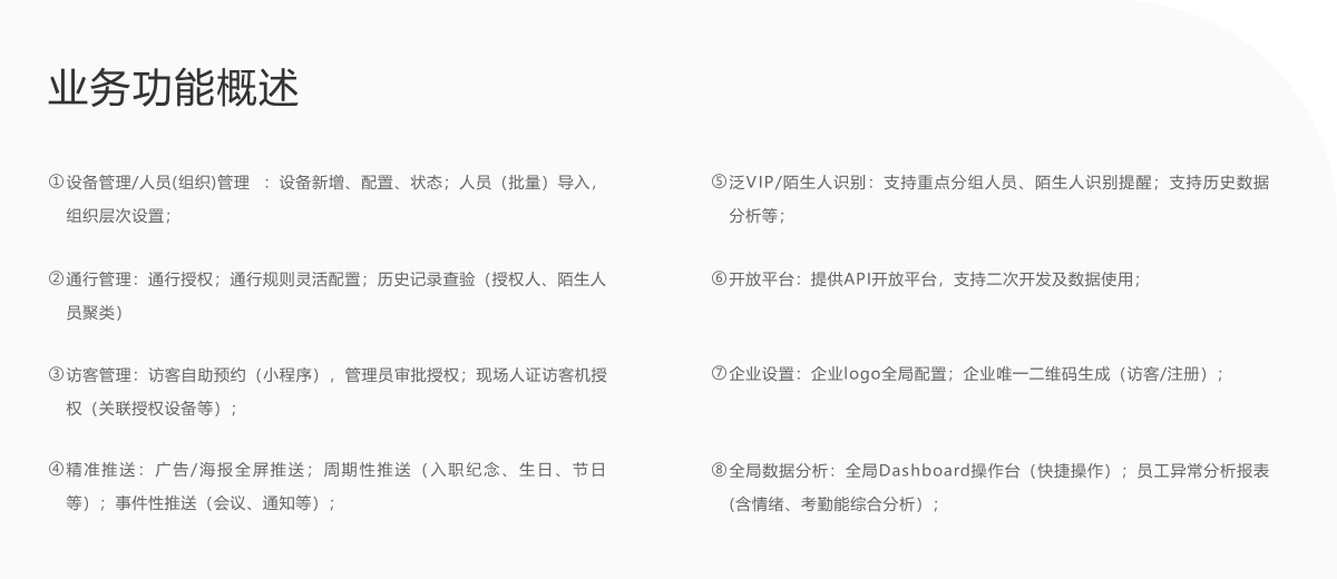 项目背景:面对现如今校园、商场、门店存在的管理、运营推广、安全方面等问题,在“5G+AI智能技术”的新挑战、新机遇下。我司针对出入管控、访客管理、考勤管理、AI辅助门卫、会议签到等不同场景,推出了人脸门禁闸机解决方案。