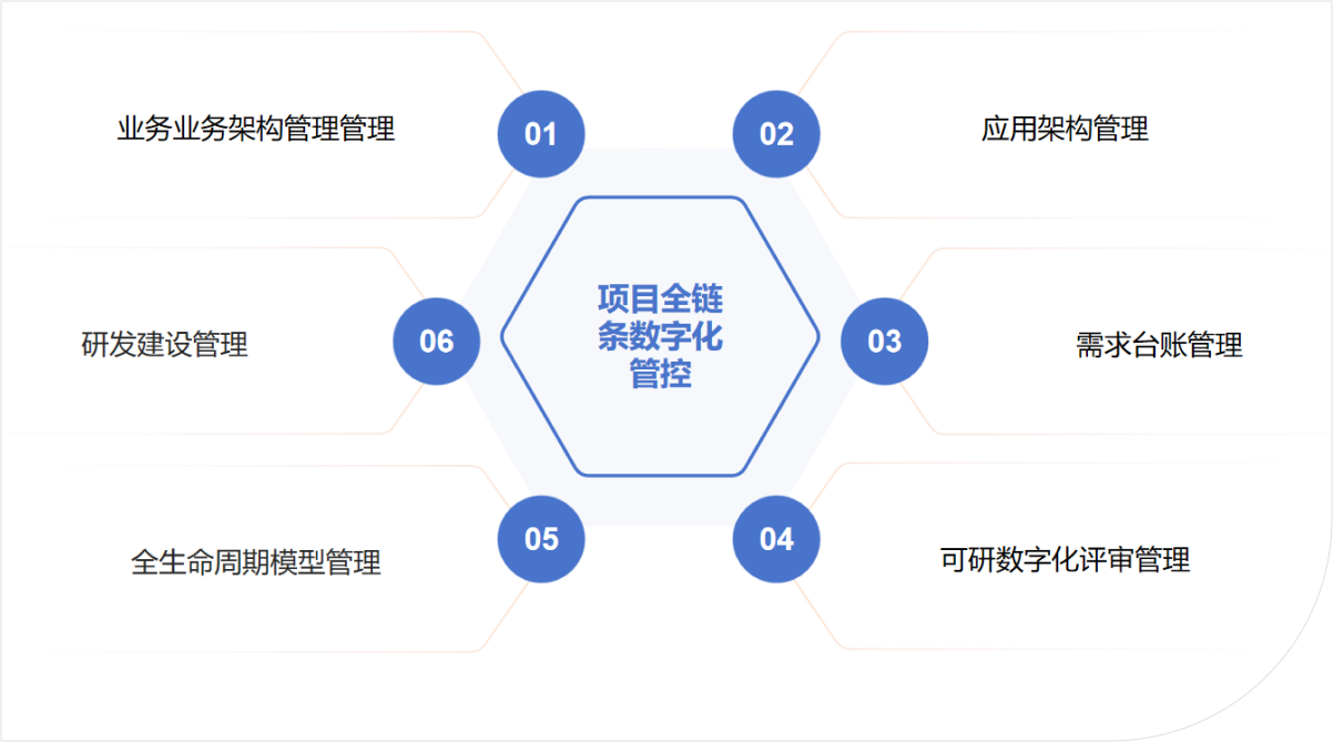 1. 项目全链条数字化管控:业务架构管理、应用架构管理、需求台账管理、可研数字化评审管理、研发建设管理、全生命周期模型管理