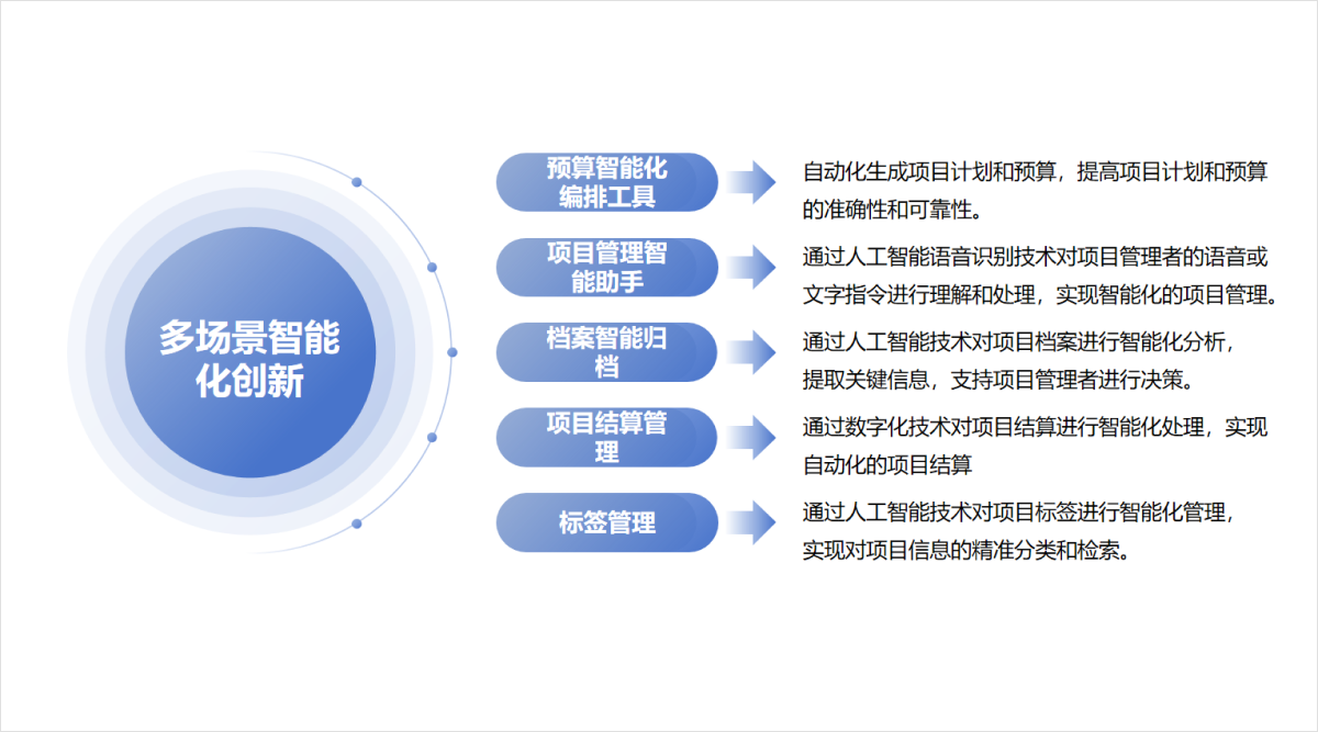 2. 多场景智能化创新应用:计划预算智能化编排工具、项目管理智能助手、档案归档管理、项目结算管理、标签管理;